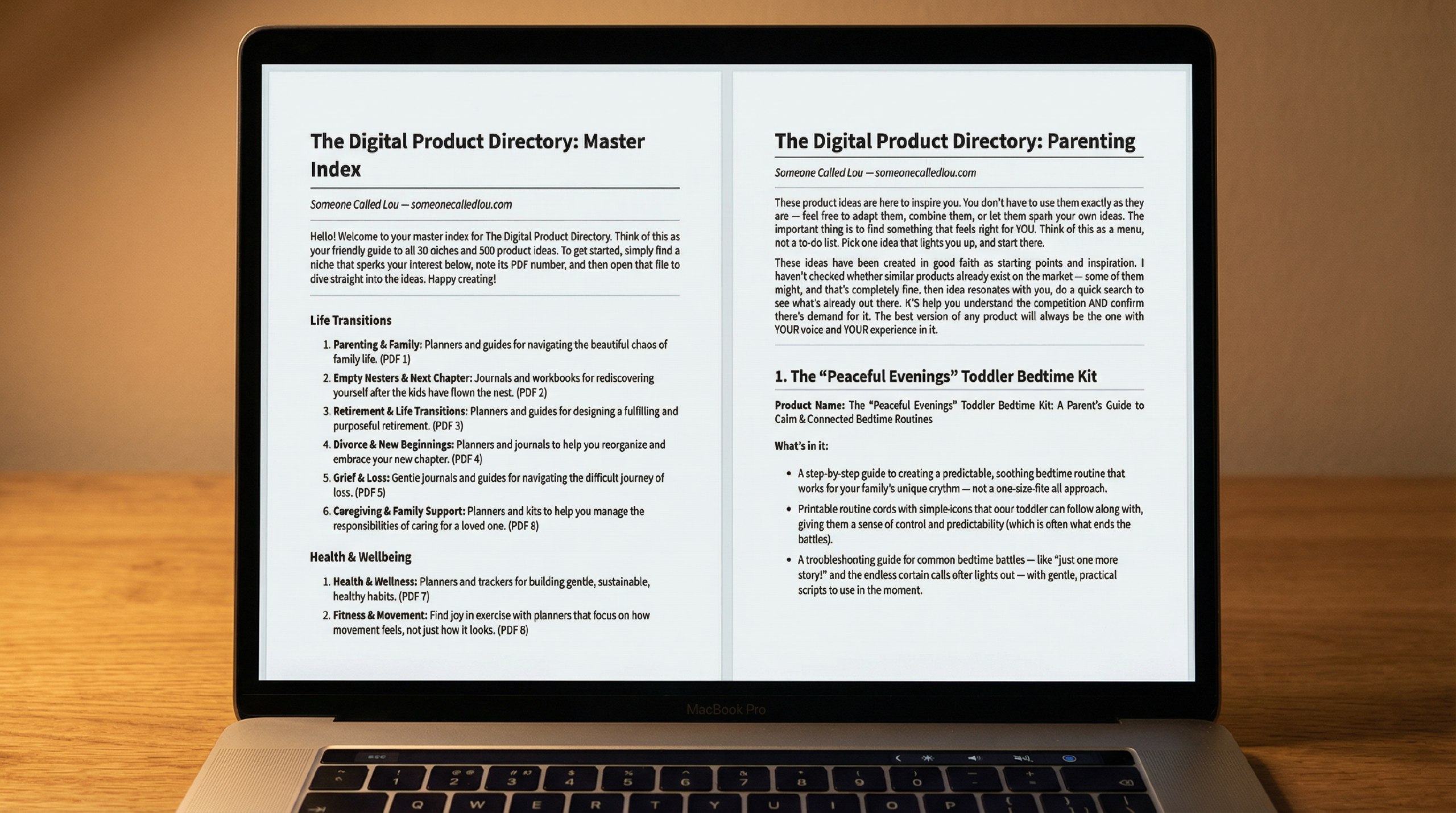 It’s a directory – a comprehensive reference guide with 500 fully planned product ideas in PDF format, organised by niche. Browse it, pick an idea, and start creating. Think of it as a product idea library you can return to whenever you need your next idea.